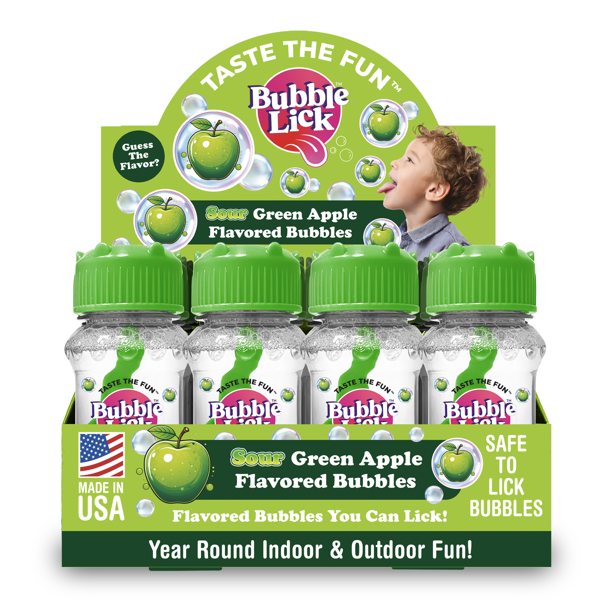 Sour Green Apple: Crisp, tangy, and mouth-puckering with a splash of green apple zing. Bubble Lick is a safe-to-lick flavored bubble solution made with food-grade ingredients for stress-free, allergy-friendly fun!